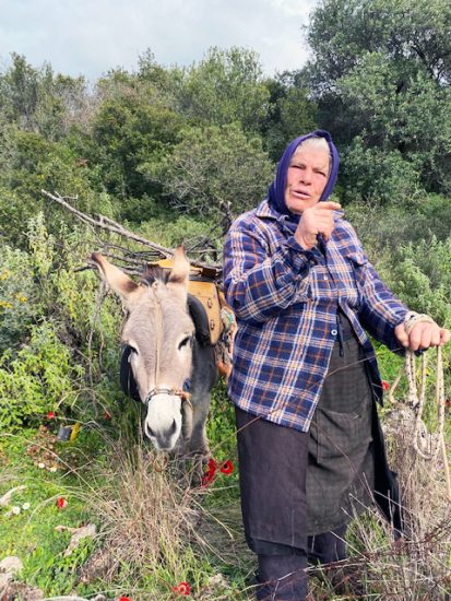 … kam hinter dem Gebüsch hervor und winkte mit einem Strauß roter Anemonen, den sie soeben von der Wiese gerupft hatte. Sie wollte uns die Blumen schenken und natürlich auch ein wenig plauschen. Woher? Wohin? Von welchen Eltern? Auch wir fragten, und so erfuhren wir: sie sei aus Altomira – das ist ein verlassenes Dorf in den Bergen, von dem ich gelegentlich erzählte (hier) – , aber sie lebe nun schon seit 30 Jahren hier unten. Unverheiratet und kinderlos, zwei Ziegen habe sie noch und den Esel – und liebevoll-zärtlich schaute sie zu ihm hin, worauf er sich neben sie stellte und bestätigend nickte, wie Esel es tun.