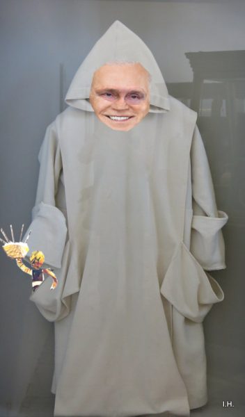 Großartige Idee, liebe Gerda, diese Puzzle-Gesichter ! Ein Längsschnitt mit jeweils einer Gesichtshälfte wäre auch sehr lohnend, ich kann sowas leider nicht. Am denkwürdigsten aber finde ich die beiden in den Taschen steckenden Gesichter und die Frage, wer in der Kutte steckt und die beiden in der Hand hat. Der Möglichkeiten gibt es viele: Narzissmus, Machtbesessenheit, der nationalistische Wahn etc etc.