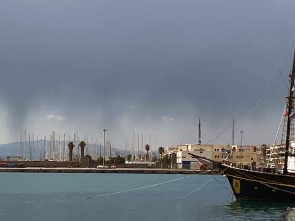 Am Hafen von Kalamata. Ich schaue nach Westen, von wo sich Regensäulen bedenklich nähern.