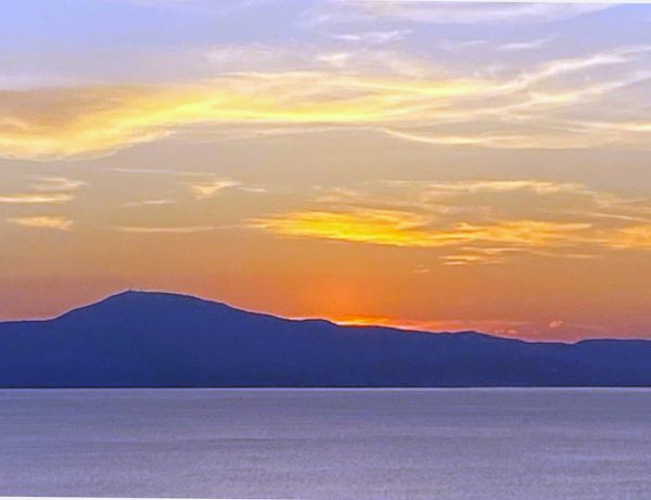 Sandwellen – Lichtwellen – und ein fast erstarrtes weinfarbiges oder purpurnes* Meer. Die Farben entfalten sich komplementär: Orange (rotgelb) und Violett (blaurot) – aber stark gedämpft durch den Einfluss des Saharastaubs, der in der Atmosphäre treibt. Die sonst vorhandene Lichtigkeit fehlt, er herrscht Zwielichtigkeit.