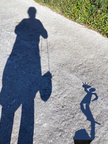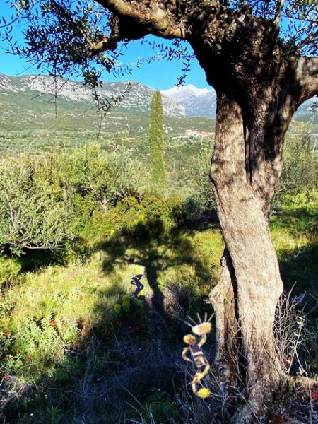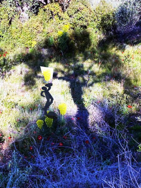 Während ich zeichnete, amüsierte sich Dora mit ihrem Schatten, der sich zusammen mit dem eines Olivenbaums in der Tiefe abzeichnete.