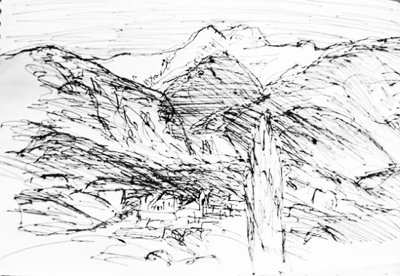 Ich fand einen Stein, um mich hinzusetzen und die Bergwelt zu skizzieren: In der Ferne die schneebedeckten Gipfel, davor die spärlich begrünten Hänge, und in der Senke das Dorf, dessen spitzer Kirchturm winzigklein die Zypresse im Vordergrund nachahmte.