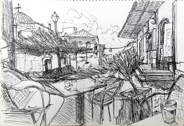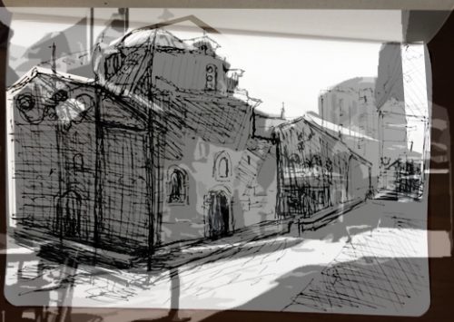 Noch einmal habe ich von fast demselbn Platz aus die kleine Kirche im Zentrum der Altstadt von Kalamata gezeichnet.