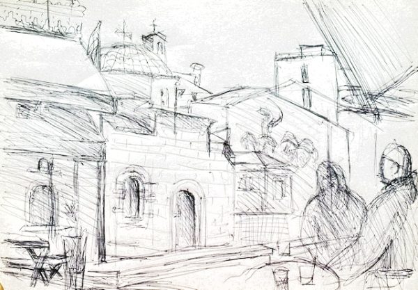 Als ich gestern zeichnete, schien mir, dass die Szene wie eingehüllt in Saharastaub und eine stille Müdigkeit dalag (hier durch einen Filter verstärkt).