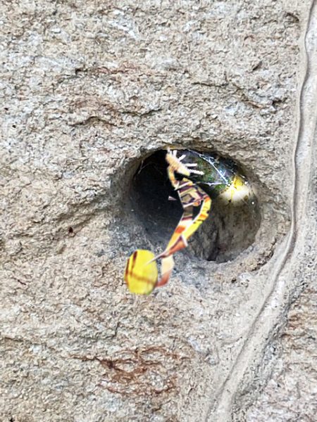 Andererseits bremse ich ihren Forschergeist: „Nein, nein, du musst jetzt nicht in jede Höhle kriechen und nachsehen, ob sie bewohnt ist, Dora! Kann ja sein, dass da Eier oder Larven drin liegen, die würdest du stören,“ ermahne ich sie.“Ach was!“ ruft sie zurück, „hier ist niemand! Und wenn ich auf Larven stoße, dann schenk ich ihnen was zum fressen!“
