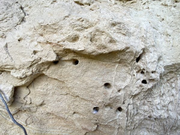 Im weicheren Sockel der Wand gibt Anzeichen von Arbeit an neuen Höhlen, die flach und an den Rändern wie aufgehäufelt wirken.