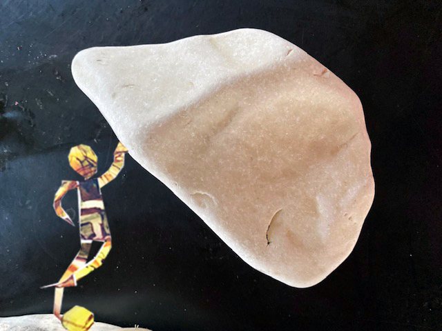Ich schaue mir also Doras Kunststücke schweigend an, bis…. ja, bis sie „Hilfe“ schreit. Der Stein ist zwar immer noch in ihrer Hand, aber sie liegt jetzt drunter und zappelt. „Nimm den verflixten Stein runter!“ schreit sie. Und das tue ich dann auch.