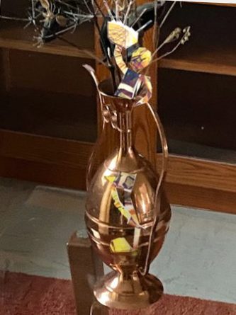 Doch schon bald ist sie wieder unterwegs. Wo wird sie sich diesmal niederlassen? Ich folge ihr neugierig mit den Augen. Verblüfft bemerke ich, wie sie sich durch den schmalen Hals einer Messingvase quetscht. Wie macht sie das bloß? Der Unterleib ist schon im dicken Bauch der Vase verschwunden, während ihr Oberteil noch in der engen Öffnung festhängt.