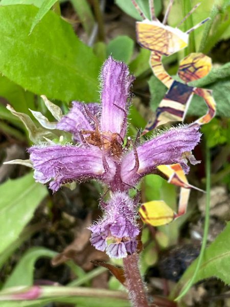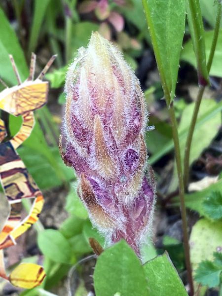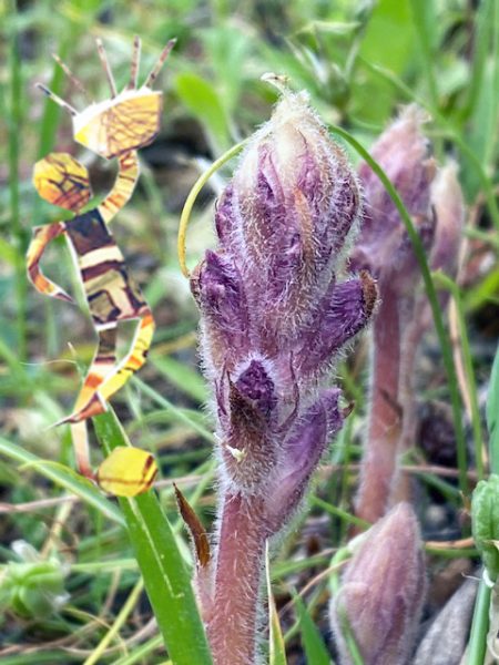 Haarig ist das Ding und geschlossen, behält seine Geheimnisse für sich. Im Gras daneben eine Blüte. Ist das nun eine Knabenkrautblüte oder wie? „Ich nehme an, dass ist die Blüte“, sage ich auf Doras Frage hin. „Sie ist ja auch haarig, und die Farbe passt“.