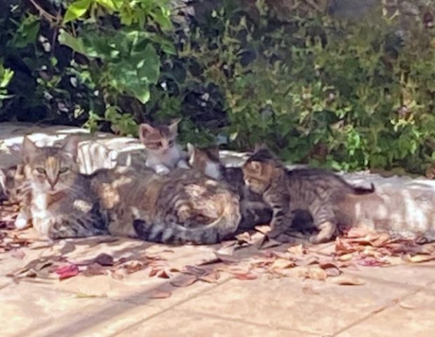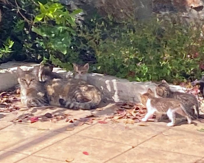 Nun also sind es fünf, die sie wieder hinter der hohen Eisentür im Abstellraum zur Welt brachte, mehrmals umzog und nun im Freien nährt und spielen lässt: vier Grauweiße wie Mama selbst und ein Goldgelbes. Wie verschwenderisch die Natur ist! Welche werden es schaffen? Wovon werden sie leben? Prinkipessa ist ja eine Wildkatze, und so wird sie wohl noch viele Male Junge bekommen, bevor es mir gelingt, sie sterilisieren zu lassen…. Wenn ich es überhaupt möchte.