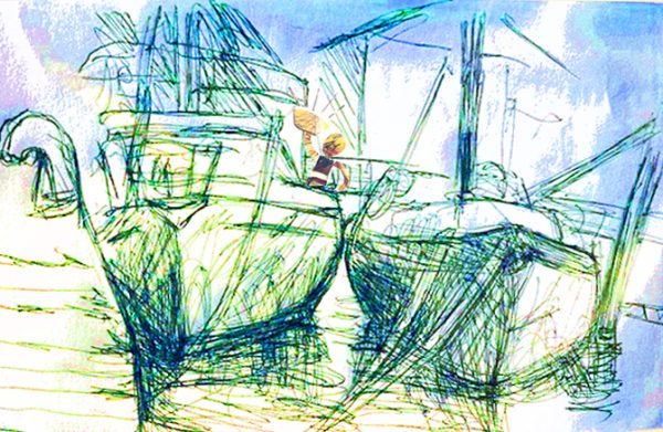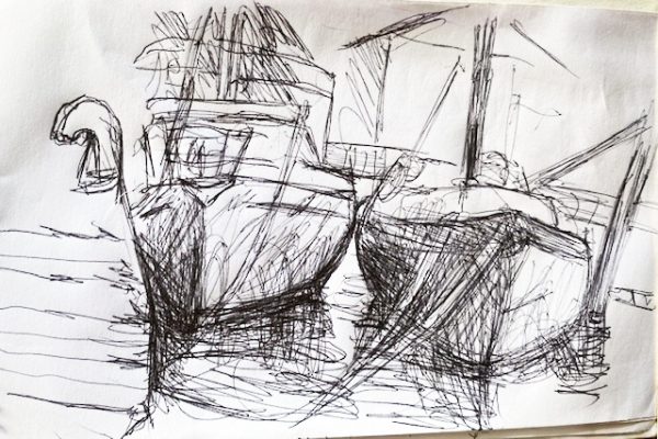 Ja, ich bin etwas lustlos, denn mir fehlt meine Begleiterin, die kleine Dora. Ich seufze und mache mich an eine zweite Zeichnung. Diesmal beschränke ich mich auf die Bootskörper, die leicht schaukeln und sich fast berühren.