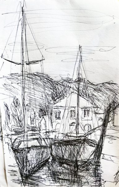 Ich sitze auf den Steinstufen, die zum Hafenbecken hinabführen, und versuche, in meinem winzigen Reporterblock zwei Boote zu zeichnen, die an der Kaimauer vertäut sind. Die Sonne scheint, ein leichter Wind geht, alles prima. Aber ich bin etwas lustlos.