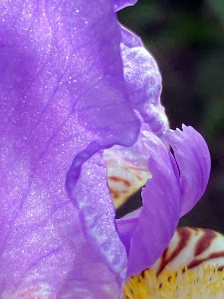 Oft betrachte ich die so merkwürdig aus Zartem und Wildem gemischte Blüte der Iris, ihre komplizierte Bauart, ihre vom späten Nachmittaglicht durchleuchteten blauen „Domblätter“ und den struppigen Bart auf dem zentralen getigerten „Hängeblatt“.