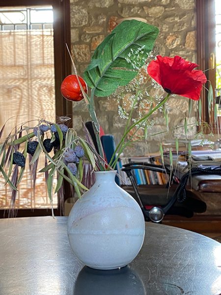 Gestern nahm ich eine Mohnblüte und zwei Stängel wildes Getreide mit nach Haus. Ich stellte sie zu einem vertrockneten Olivenzweig und einer künstlichen Stechpalme mit roter Frucht in die weiße runde Vase auf dem schwarzen runden Tisch. Zwei rote Tupfer: ein lebendiger, ein toter.