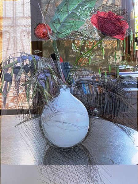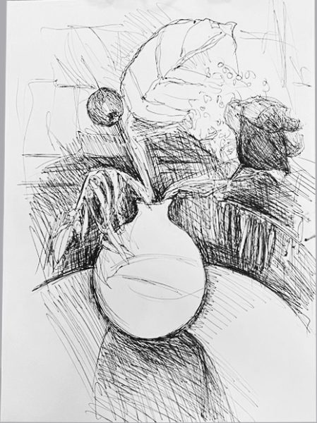 Dein Stillleben sieht so oder so ganz toll und zumindest auf dem Foto durch diese leuchtend roten Blüten sehr lebendig aus. Aber auch die Zeichnung ist dir in schwarzweiß wie immer ganz toll gelungen, wobei evtl nur einige gut platzierte Farbeffekte, keine Überlappung, auch dieses Bild mehr zum Leben erwecken würde denke ich….