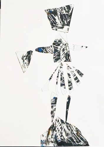 Ich sehe darin ein Vogelwesen (1), das zum Menschen mutiert (2), einen Moment des Triumphes erlebt (3) und am Ende zur resignierten Frau wird, die sich selbst Scherbe für Scherbe in einen großen Müllsack fallen lässt (4).