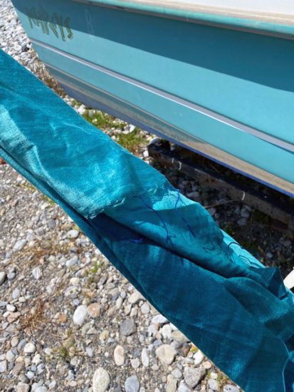 Heute wehte ein leichter Wind, und wie ich so am Strand warte, bis mein Mann die Einkäufe erledigt hat, fällt mir ein Bötchen auf. Es hat die Farbe des Schals, den ich vor ein paar Tagen geschenkt bekam und um den Hals gewickelt hatte.