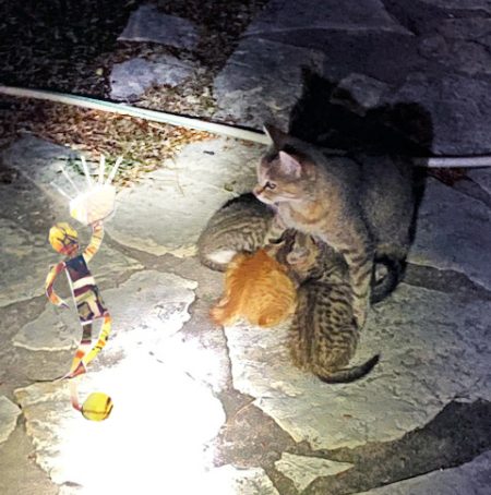 „Und Prinkipessa?“ – Na gut, auch Prinkipessa mit ihren gar nicht mehr so kleinen Kleinen, des Nachts. Der rote Theo ist gut zu erkennen. Auch Frieda, Fritzi und Ferdinand sind bei ihr. Ein ungetauftes Kleines fehlt. Es wurde überfahren, als die Familie einen Ausflug machte. Ich sah es auf der Straße liegen. Traurig.