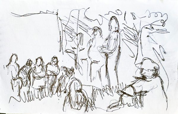 Für drei Skizzen im Reporterblöckchen reichte gestern die Zeit. Zwei entstanden bei einer Rast im Hof einer Kirche, eine bei der Einführungsrede von Herrn Maniki.