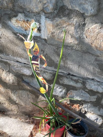 Inzwischen ist auch der zweite Zwiebelspross herangewachsen. An dem größeren Spross windet sich Dora empor.