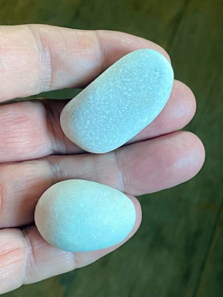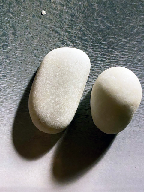 Dora hüpft zwischen des Fotos und den realen Steinen hin und her. „Sie haben auch eine andere Farbe!“ schreit sie. „Sie sind weiß, aber einmal sehen sie blau und dann wieder grün aus!“ – „Ja, stimmt,“ sage ich. „Es liegt am Himmel und am Licht: Das Blaue habe ich am Vormittag neben dem Fenster aufgenommen, da kommt das Himmelsblau ins Spiel. Bei dem Grünlichen war ich wohl etwas mehr im Zimmer, so dass sich auch Lampenlicht eingemischt hat.“ – „Kannst du sie nicht mal weiß fotografieren?“ Ich versuche es, lege die Steine auf den graufarbigen Umschlag von Hannahs Gedichtsband „Uferzeilen“, das neben mir auf dem Schreibtisch liegt, weil ich ab und zu gerne hineinschaue. Ich rücke es nahe ans Nordfenster und knipse. Dann korrigiere ich die Farben noch ein bisschen per Fotoshop. „So?“ frage ich Dora. Sie nickt. Ja. So sehen sie aus, diese Steine.
