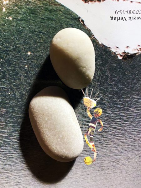 Dora sitzt auf meiner Schulter und sieht zu. „Was sind das für Steine?“ fragt sie. „Die habe ich noch gar nicht gesehen.“ –  „Ich habe sie kürzlich am Strand aufgelesen und eingesteckt,“ sage ich und zeige sie ihr.