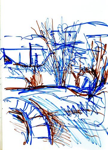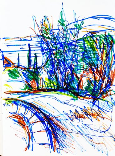 Im Bemühen, meine Farbangst zu überwinden und wieder zum Malen zu kommen, habe ich gestern mit farbigen Filzstiften gezeichnet. Das ist ein recht kindliches Medium. Farbmischungen sind nicht möglich. Man kann die farbigen Linien nur addidativ neben- oder übereinander legen. Das Auge muss sie dann selbst mischen.
