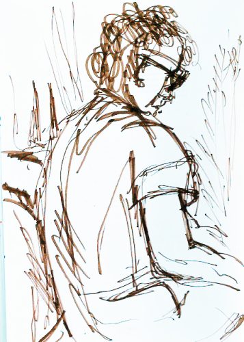 Dann skizzierte ich die Freundin, die ihrerseits zeichnete, drei Mal: mit braunem Stift, mit rotem Stift und noch mal mit braunem Stift. Diese Zeichnung überging ich dann mit den Farben Orange, Rot und Blau.