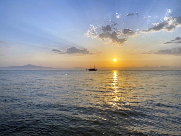 Gegen Abend dieses heißen schwülen Tages machte ich mich auf die Socken, um eine Runde zu schwimmen. Wunderbar kühlend war das Wasser, ich genoss es sehr und schwamm recht weit hinaus. Da sah ich das Piratenschiff um die aus groben Felsen geschichtete Schutzmauer der Bucht biegen. Gerne hätte ich eine Aufnahme davon gemacht, aber bis ich wieder am Strand war, wäre das Schiff längst vorbei.