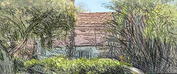 Einen kleinen Park gibt es in Kalamata, dahinter die Hafenzeile mit Zollgebäude, Post und anderen schönen alten Gemäuern. Ich sitze auf der einzigen einigermaßen schattigen Bank, um ein wenig zu zeichnen. Der Durchblick ist durch Bäume und Büsche verstellt, aber einen besseren Platz gibt es nicht. Also los. Ich nehme mein hellgrünes Moleskine-Zeichenbuch mit den vielen leeren Seiten und einen feinen Tintenstift, der auf halbem Weg den Geist aufgibt, und mache mit einem gröberen schwarzen Kuli weiter.