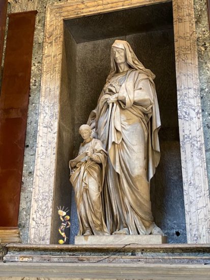 Die letzte Reise hat bei Dora eine neue Nachdenklichkeit hinterlassen. Sie wird sich ihres Beginns und Endes bewusst, sie ordnet sich ein und bemerkt, dass ihr Hier und Jetzt nicht alles ist. Kurzum, sie beginnt, ihre Existenz zu relativieren. Solange sie hier bei uns in der ländlichen Provinz, unter Katzen und Blumen, zwischen den erhabenen Bergen und dem ewigen Meer ihre Erfahrungen sammelte, hatte sie nie solche Anflüge von Selbstwert-Unsicherheit. Rom hat für sie erstmals den Sack der menschlichen Geschichte weit geöffnet. Da steht sie nun winzig neben der Übermutter Roma im Pantheon und hält tapfer ihre Fackel hoch. Doch deren Strahl dringt nicht bis in die Höhe der alten Mutter.