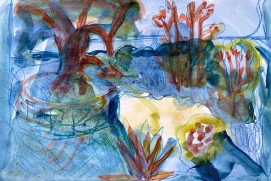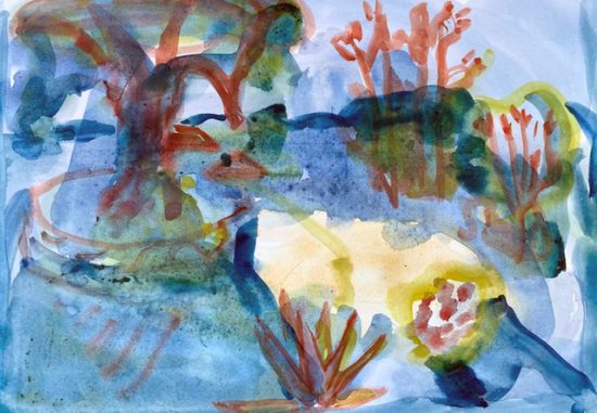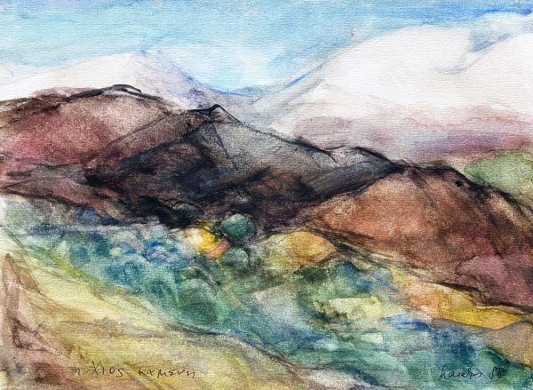 Ich nahm den Aquarellkasten, entschlossen, ohne jeden Ehrgeiz einfach vor mich hin zu malen. In den ersten Jahren malte ich oft mit Aquarellfarben, brachte es auch zu recht netten Ergebnissen. Vor ein paar Tagen fiel mir ein altes Blatt in die Hände: eine von einem Brand verheerte Landschaft auf der Insel Chios. Es gefiel mir, und so fotografierte ich es, um es hier bei Gelegenheit zu zeigen – zum Glück, denn bei einer Gruppensitzung anderer Art wurde es versehentlich zerschnitten.