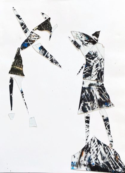 Am 21. März dieses Jahres hatte das Glasscherbenspiel mit Doras „schwarzer“ Pädagogik ein come-back und fordert seither zu immer neuen Gestaltungen heraus. 17 schwarz eingefärbte, zerkatzte Scherben sind es, ein paar recht große, manche lang und spitz, ein paar klein und ganz durchsichtig. Hinzu gekommen sind inzwischen drei schwärzliche Pappstückchen aus dem Set von Jürgen Küster (aka Buchalov), die ich hier als Hüte, Kopf und Röckchen verwende.