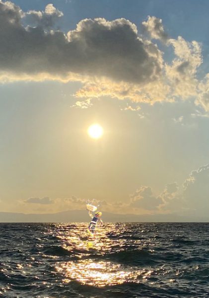 Oder kann ich es doch? „Na schön, gehen wir lieber schwimmen!“ sage ich zu Dora und stehe auf, suche meinen Kram zusammen, und auf gehts. Das Meer ist wild und die tiefstehende Sonne so hell, dass ich auch mit zusammengekniffenen Augen kaum aufs überglänzte Meer blicken kann. Im Wasser und auf dem Lande tummeln sich noch etliche Menschen. Wind und Wellen lachen. Herrlich, nix wie rein!