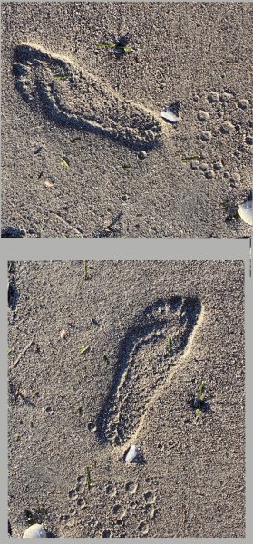 Gestern fotografierte ich meinen Fußabdruck im nassen Sand, in der Absicht, ein von Joachim Schlichting kürzlich gezeigtes Phänomen einmal selbst zu erzeugen. Daraus wurde freilich nichts, denn eine Welle ebnete meine Fußabdrucke ein, bevor sie trocknen konnten.