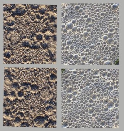 Aber etwas andere erregte meine Aufmerksamkeit, als ich die Fotos betrachtete: mal schien es sich um eine konkave in den Sand eingedrückte Form zu handeln, mal um ein flaches konvexes Relief, das sich aus der sandigen Grundfläche abhob. Ich drehte und wendete die Fotos in alle Richtungen – es war wie ein Vexierspiel. Auch die Tropfen im Sand schienen mal kreisrunde Höhlungen, mal aufliegende Sandknöpfchen zu sein.