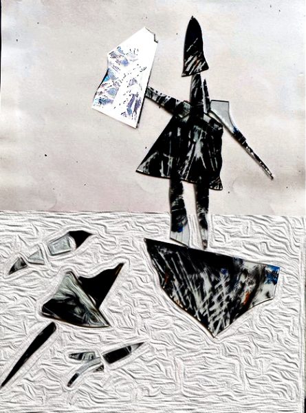 „Sieht man doch! Sieht man doch!“ äfft mich Dora nach. „Was soll das denn sein, eine Spiegelfischerin? Nie gehört. Ich sehe jemanden mit Schild und Speer, der sich gegen anfliegende Waffen verteidigt.“ – „Na fein“, sage ich. „Dann siehst du ja was. Warum fragst du mich dann, was das ist?“ – „Weil…“ Dora stutzt und denkt nach. „Weil ich wissen wollte, was du mit deinem Bild sagen willst.“- „Hab ich dir ja gesagt: eine Spiegelfischerin. Und als ich es dir sagte, passte es dir nicht.“ – „—-“