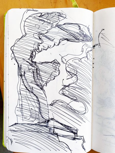 Ich setze mich hin und versuche, die Nike zu zeichnen, wie sie auf hohem Sockel vor dem Museum von Samothrake dem Himmel entgegen stürmt, begleitet von den Silhouetten der Bäume.