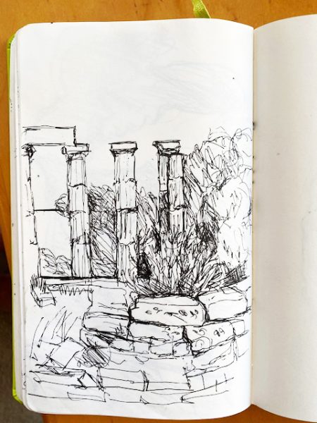 Ich versuche, mich zeichnend zu verbinden, setze mich auf einen Marmorblock und zeichne die aufgerichteten Säulen, die so charakteristisch für den Bezirk sind.