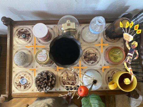 Aha, Frau Kugeluhr-unter-der-Haube ist mit Tick und Tack als Erste zur Stelle ! Schon kommen auch Frau Plasteflasche und Madame Keksdose angewackelt Die Zwillige Knopf und Deckel möchten keinesfalls fehlen. Familie Kerze nimmt gleich auf drei Feldern Platz, Herr Stein rollt und kugelt sich zurecht, bis er eine gute Position im Kreis gefunden hat. Herr Zapfen verzichtet auf den Streich, um dabei zu sein. In der Mitte aber positioniert sich selbstbewusst eine gelb gekleidete Dame – oder ist es vielleicht ein Herr? „Herr Becher! Frau Tasse! Schön, dass Sie auch vorbeikommen“, freut sich Dora.