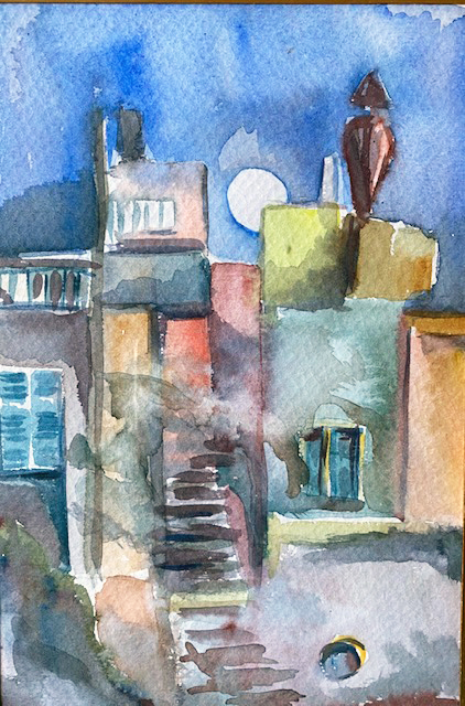 Als ich vorhin nach Bildern zum Zerschneiden guckte, fiel mir auch ein recht kleines Aquarell in die Hand. Das mochte ich mal sehr. Falls jemand von euch interessiert ist: ich verkaufe es für 200 E, samt vorhandener Rahmung und Versand.