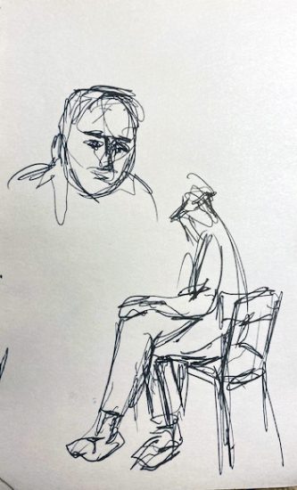 Dann wende ich mich in die andere Richtung: ein dünner müder Mann hängt auf einem Stuhl,, isst sein Sandwich und verschwindet. Von einem anderen schaffe ich nur einen ungefähren Eindruck des Gesichts festzuhalten.