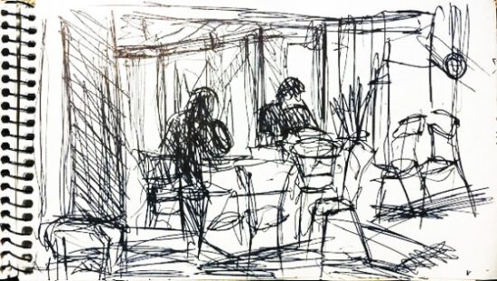Viel ist ncht los auf der Autobahn Korinth-Kalamata, also ist auch die Autobahnraststätte, an der wir für einen schnellen Imbiss halten. fast leer. Ich nehme zwei schwere dunkle Gestalten ins Visier, um sie zu skizzieren. Eingebaut sind sie, so lange sie dort sitzen, in ein surrounding von leeren Stühlen, Raumteilern, Glastüren, Zimmeragaven.