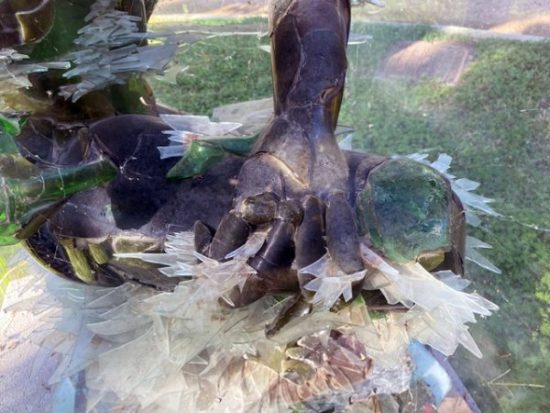 Zur Ergänzung zeige ich nun noch Detailaufnahmen der krallenartigen Füße. Da sieht man dann auch das weißliche Glas besser, das von der grünen Glasskulptur abzusplittern scheint. Wie abgebrochenes Gefieder….