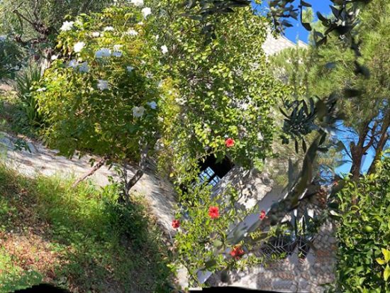 Mein Garten ist mir lieb, aber ein Zaubergarten mit Wegen, die wellenförmig das Grün durchströmen, ist er nicht – außer ich fotografiere ihn mit der Panorama-Einstellung und führe dabei das Handy schwungvoll über Haus, Bäume und gepflasterte Wege. Gerne würde ich euch das Ergebnis in Groß zeigen – doch fehlt mir dafür der Speicherplatz. Ein Detail (Mittelteil des obigen Fotos) muss reichen.