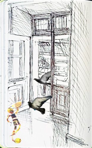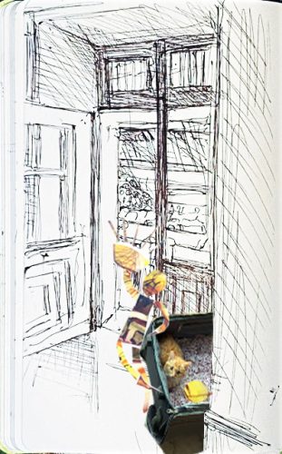 Es regnet draußen, ein verabredetes Treffen fiel wegen Erkrankung aus. Was tun? Da wäre zum Beispiel diese Zeichnung von gestern: die Eingangstür der Taverne, durch die man den Vorplatz mit Tischen und Blumen sowie das Gemäuer des gegenüberliegenden Kirchleins sieht….