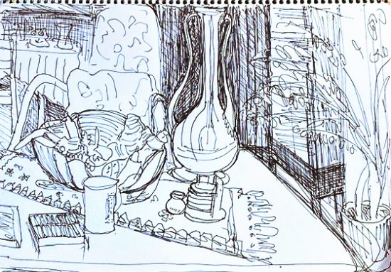 Die Kandidatenkür für 2023 hält mich in Atem. Da ist das tägliche Zeichnen zu kurz gekommen. Nun wieder in Maroussi (nördlicher Vorort von Athen), habe ich mich hingesetzt und gezeichnet, was dort auf dem hellholzigen Couchtisch herumsteht und liegt: eine elegante Keramikschale mit einem Sammelsurium aus Hölzern, Muscheln und Kerzen, eine hohe Zinnvase, ein rundes Väschen und ein Set Untersetzer für Gläser, der unvermeidliche Kaffeebecher (weiß mit Grundriss des Parthenon), eine Webdecke und eine Schachtel mit neu erworbenen Wachsstiften, die man mit Wasser vermalen kann. Ausprobiert habe ich sie noch nicht, dafür fehlte mir der Mut. Ich blieb beim gewohnten Kugelschreiber. – Im Hintergrund tummeln sich ein Schaukelstuhl, ein großer Arbeitstisch, ein Eulenschrank, Fenstertüren mit Gardinen und ein Benjamin im Topf.