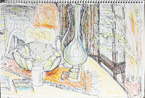 Nun aber habe ich mal wieder Farben gekauft. Kindliche Farben. Ölkreiden, die man mit Wasser vermalen kann, steht auf der Packung. Auf meiner letzten Zeichnung (Was so auf dem Tisch steht) sieht man sie, offen, aber noch unbenutzt. Farbigkeit stellte ich durch elektronische Überblendung mit einem Foto her.