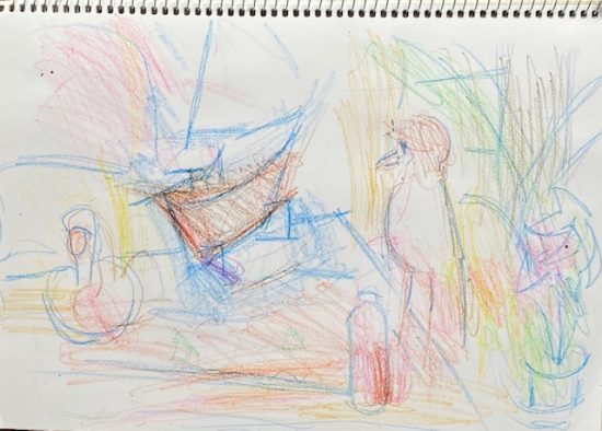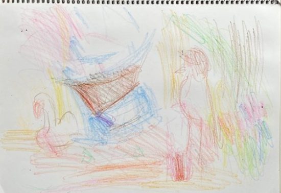 Mit meinen neuen Wachsstiften tastete ich mich an die Farbigkeit des Motivs heran. Ganz konnte ich die dreidimensionale Dingwelt freilich nicht vergessen. Und so trug ich schließlich ein paar Umrisse und Raumtiefe angebende Linien ein.