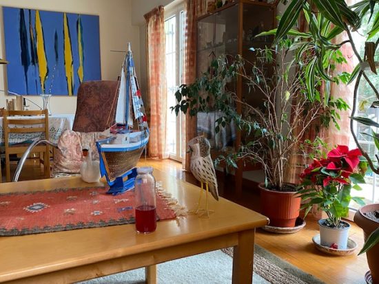 Zum Motiv: Das Boot oder Schiff ist seit alters her mit Weihnachten verbunden (es kommt ein Schiff geladen…). Die Tanne hat es bisher nicht vermocht, das Symbol ganz zu verdrängen. In griechischen Schaufenstern ist es dieser Tage omnipräsent. Auch ich habe unser Weihnachtsschiff entstaubt und Fähnchen, Segel, Wanten in Ordnung gebracht. Da mir grad sehr nach Farbe ist, habe ich zudem einen roten Christstern besorgt. Dem Boot habe ich eine Eule und einen Schwan aus Filz* zur Seite gestellt.